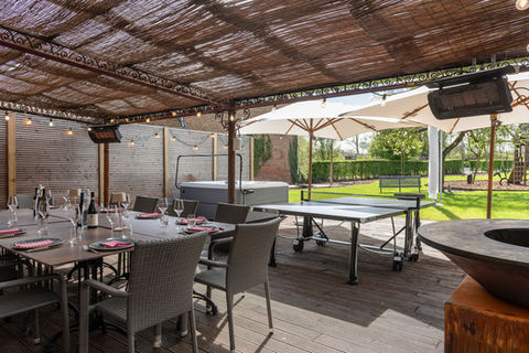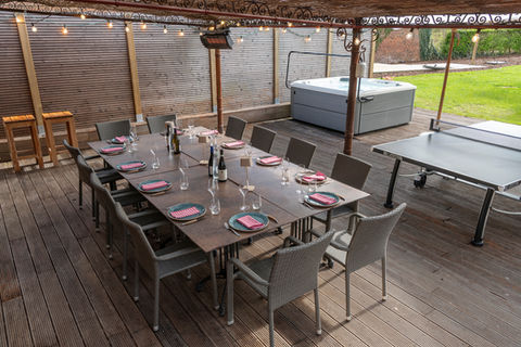 Buiten bevindt zich een overdekt verwarmd terras met een grote tafel voor 16 personen. Achteraan op het terras is er een grote jacuzzi voorzien en een toilet.